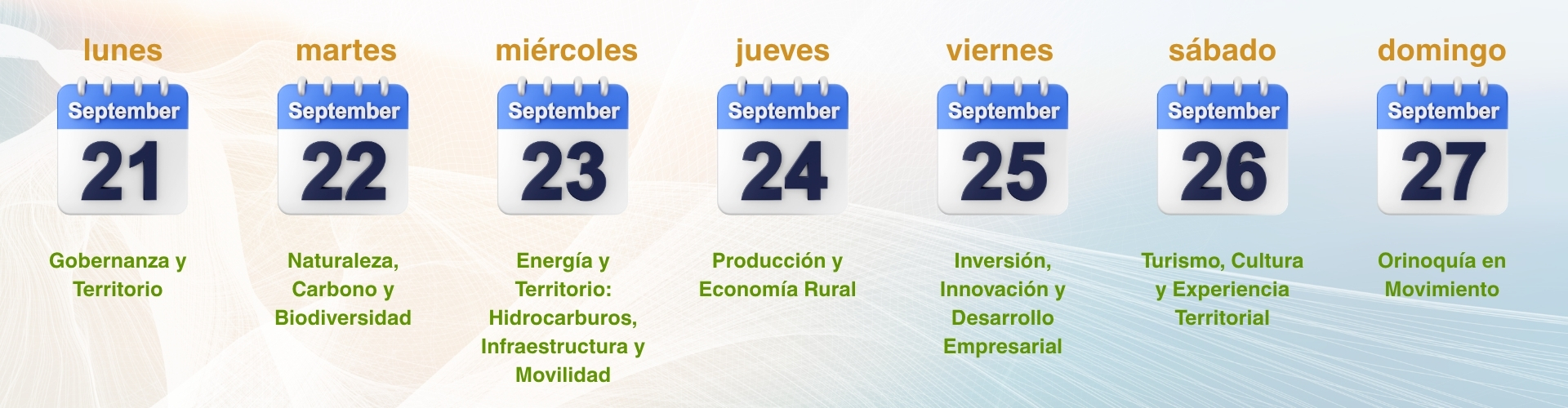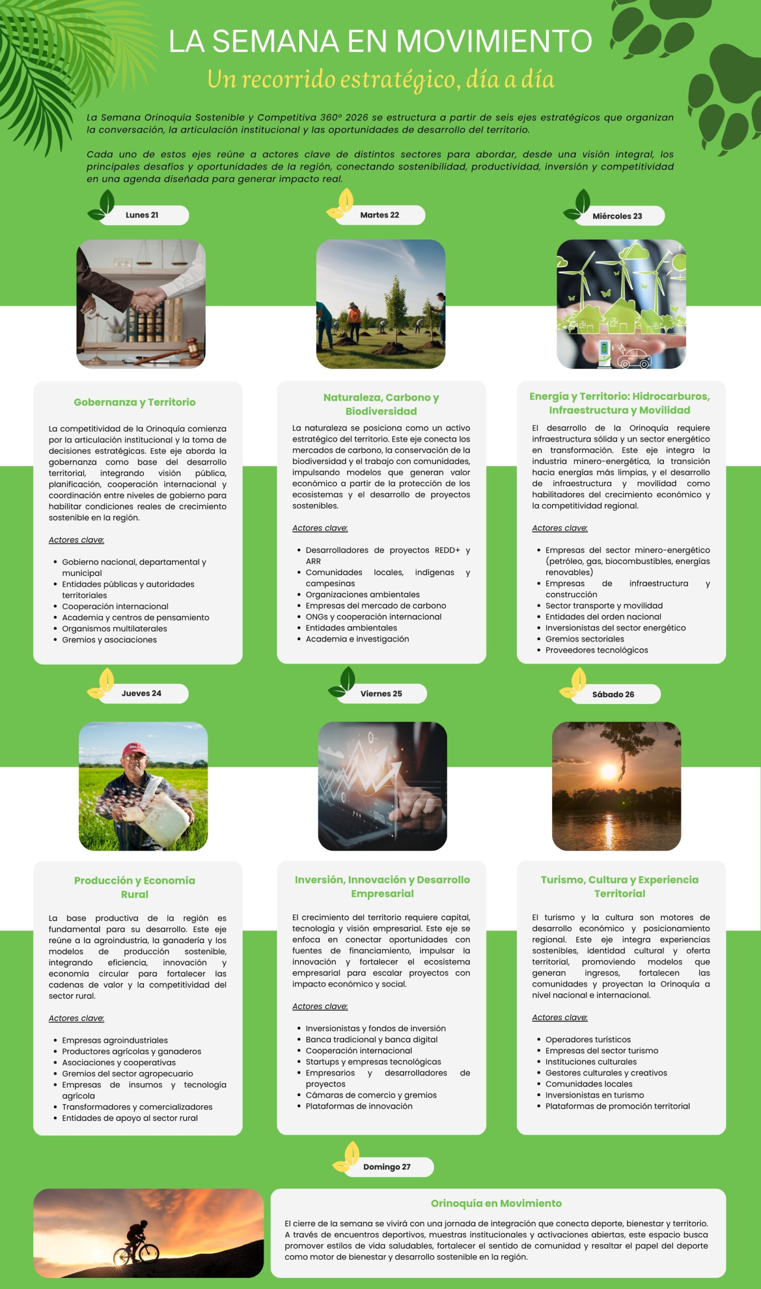 La Semana Orinoquía Sostenible y Competitiva 360° está diseñada para fluir de manera clara, estratégica y orientada a resultados. Cada día se estructura alrededor de un eje temático que organiza las conversaciones, los espacios de encuentro y las oportunidades de relacionamiento, permitiendo a los participantes identificar fácilmente cuándo participar, a quién conectar y qué oportunidades activar.